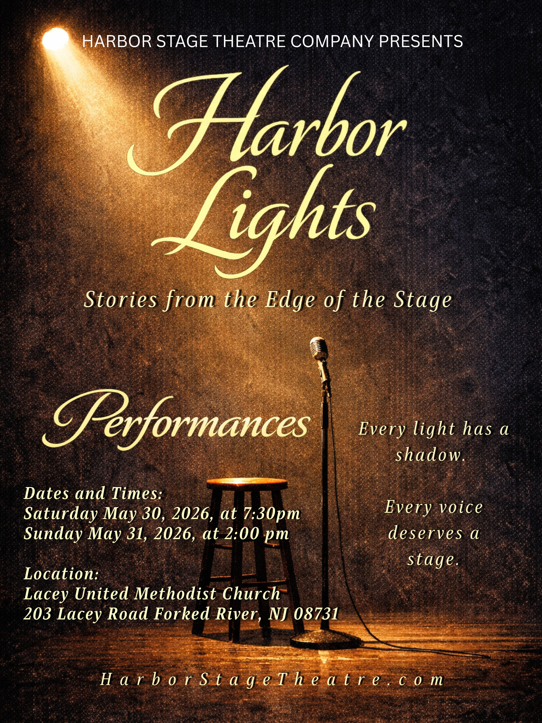 Live Theatre That BringsOur Community Together Bold, accessible productions in Lacey, New Jersey See What's On Stage Support Local Theatre Producing Quality Theatre 2026 Why Support Harbor Stage? Offering Arts Education Building Community Supporting Local Artist Make an Impact "Awesome Company!" "Great talent and live entertainment." "Audience was engaged and enthusiastic." "Can't wait to see what's next!" "Awesome Company!" "Great talent and live entertainment." "Audience was engaged and enthusiastic." "Can't wait to see what's next!" "Awesome Company!" "Great talent and live entertainment." "Audience was engaged and enthusiastic." "Can't wait to see what's next!" Auditions Get Involved Volunteer Donate Join Our Mailing List